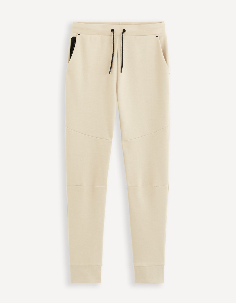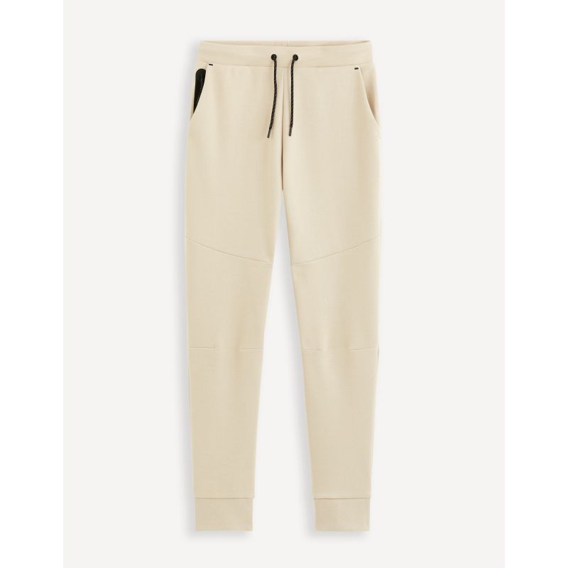 Sportovní jednobarevné tepláky. Pružný pas se stahovací šňůrkou. Šikmé boční kapsy. Dlouhé nohavice s náplety.