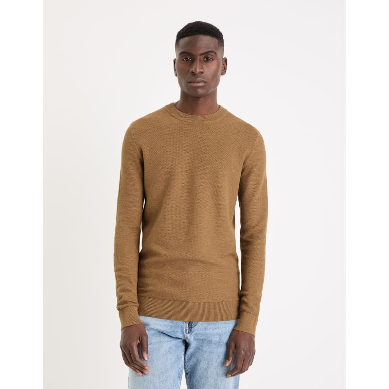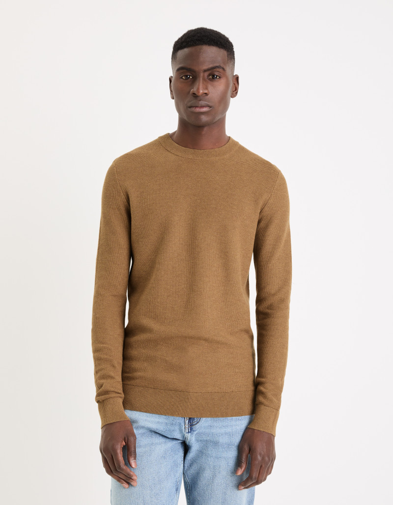 Svetr s kulatým výstřihem a drobnou strukturou. Příjemný materiál. Svetr lze nosit s košilí a výstřih oživit límečkem. S prošívanou vestou v kontrastní barvě získáš trendy outfit.
