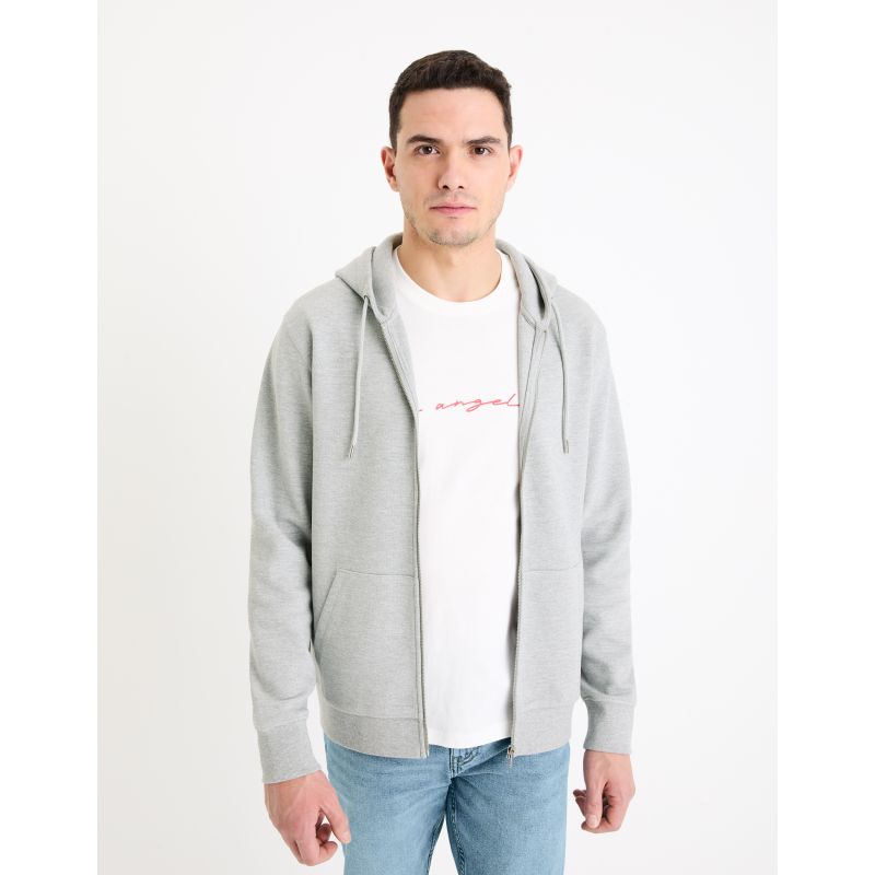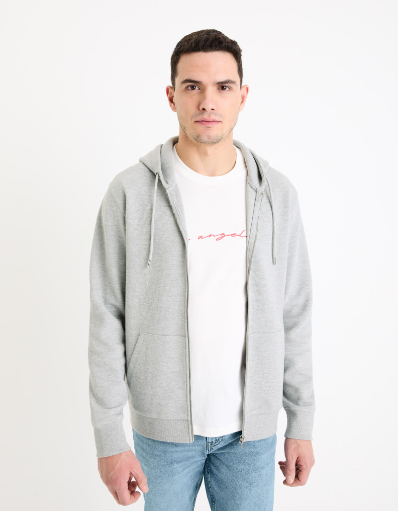 Mikina se zapínáním na zip. Kapuce se stahovací šňůrkou. Klokaní kapsa. V šedé barvě.