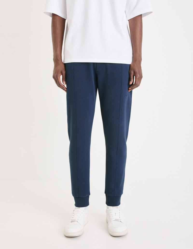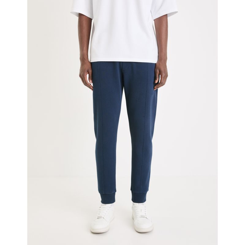Sportovní tepláky. Pružný pas se stahovací šňůrkou. Šikmé boční kapsy na zip. Dlouhé nohavice s náplety.