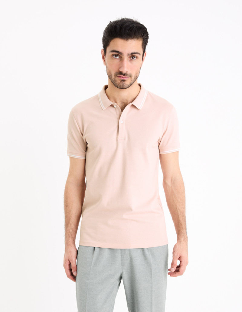 Polo tričko s krátkým rukávem a drobnou reliéfní strukturou pique. Měkký límeček se zapínáním na knoflíčky. Tričko má rovný střih. Rukávy a límec je lemován pruhy v kontrastní barvě. Polo tričko se hodí nejlépe k džínům a teniskám.
