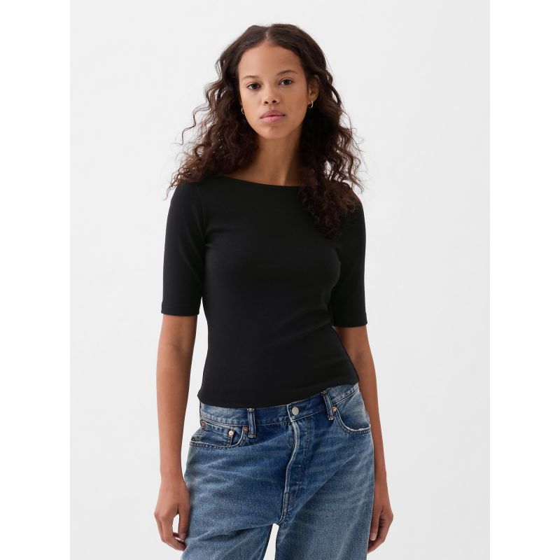 Dámské jednobarevné tričko.Lodičkový výstřih.Hluboký výstřih na zádech.Krátké rukávy.Slim střih a cropp délka.Příjemný materiál bavlna a modal.
