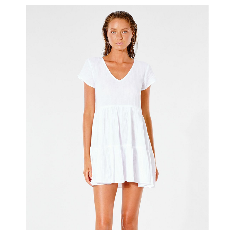Romantické dámské šaty Premium Surf Dress Dusk White s krátkými rukávy. V bílé barvě. S výstřihem do zakulaceného písmene V. Šaty mají vzdušný střih, jsou vyrobeny ze 100% bavlny. Jednoduchý letní model, který si oblíbíte.