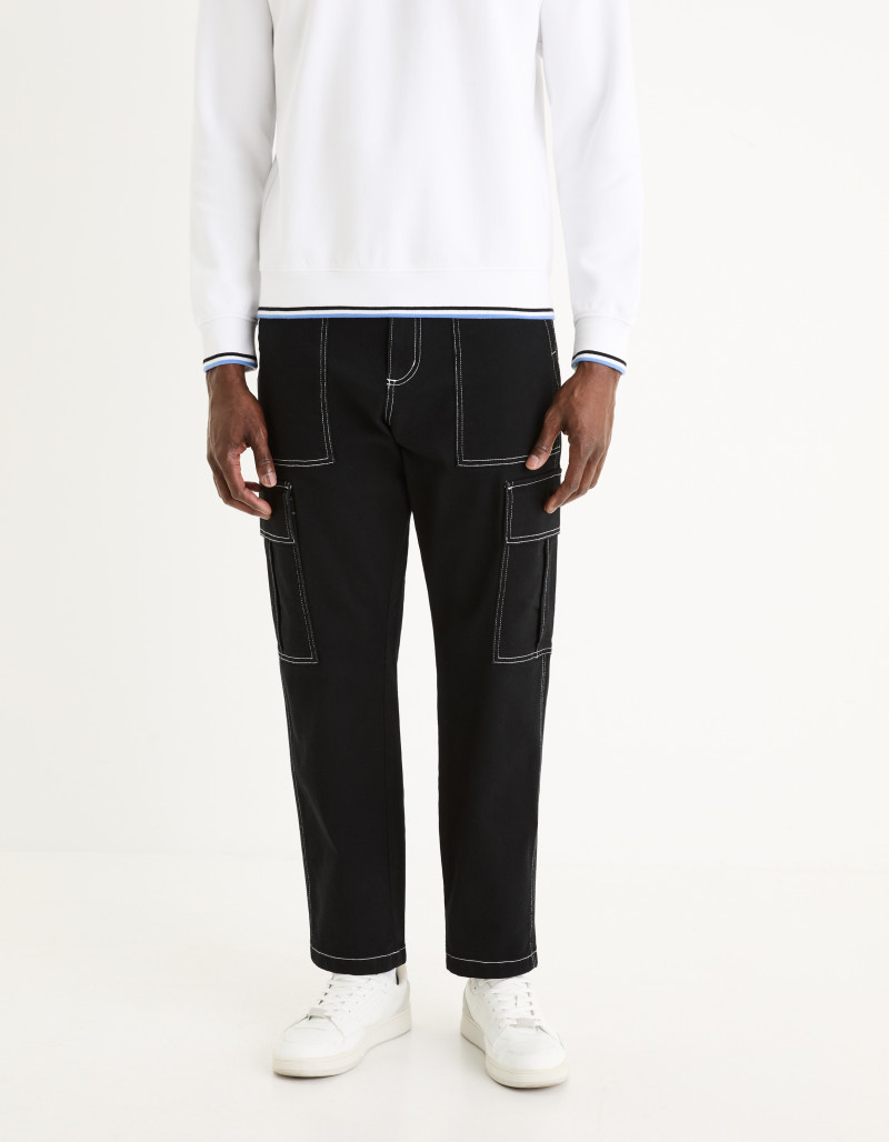 Kalhoty s kapsami a prošitím v kontrastní barvě. Vyrobeny ze strečové bavlny. Na stehnech má našité velké kapsy s klopou. Mají pevný pas se zapínáním na knoflík a zip. V pase poutka na pásek a přední kapsy. Nosí se s tričkem a mikinou.