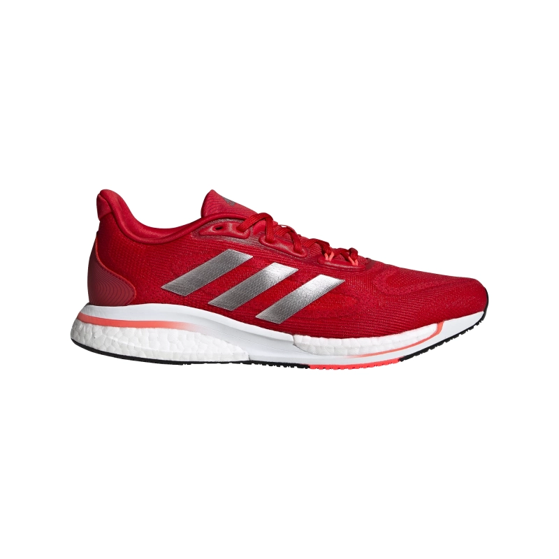 Pánské běžecké boty adidas Supernova+ červené na silnici využívají kombinaci odpružení BOOST a Bounce. Mají hybridní mezipodešev s extra odpružením Boost.