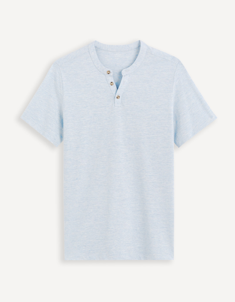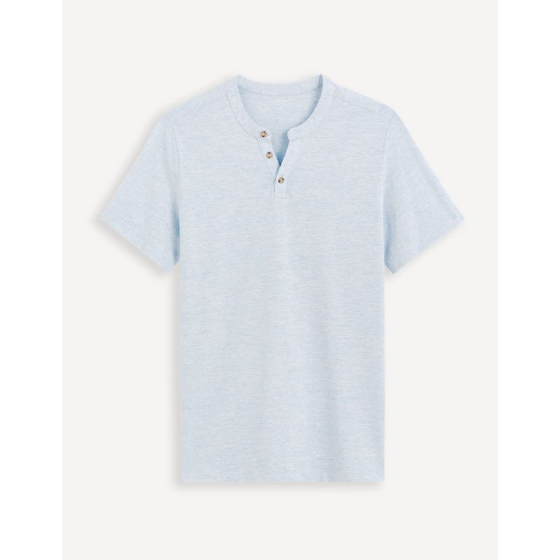 Tričko s kulatým výstřihem a zapínáním na knoflíčky. Tričko má krátký rukáv a rovný střih. Mít zásobu triček se vyplatí. Tak jich pár přihoď do košíku a nezapomeň na košile.