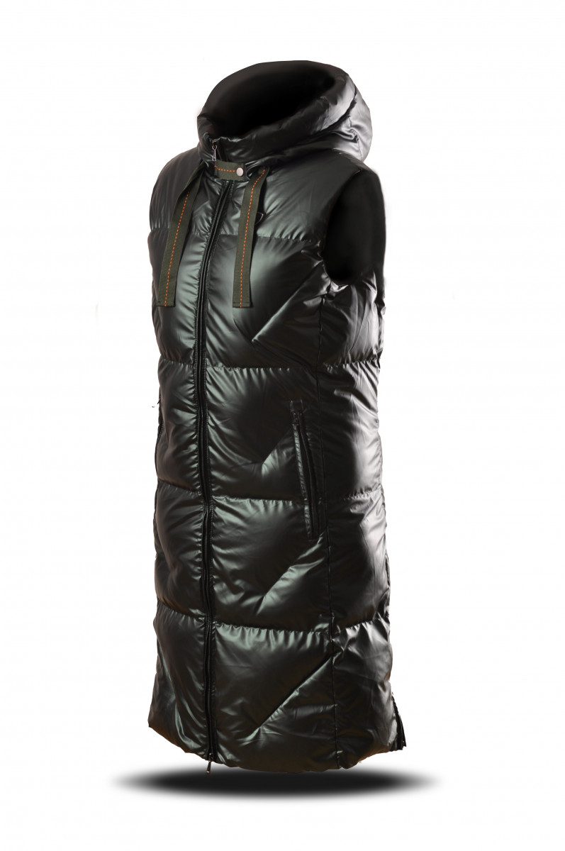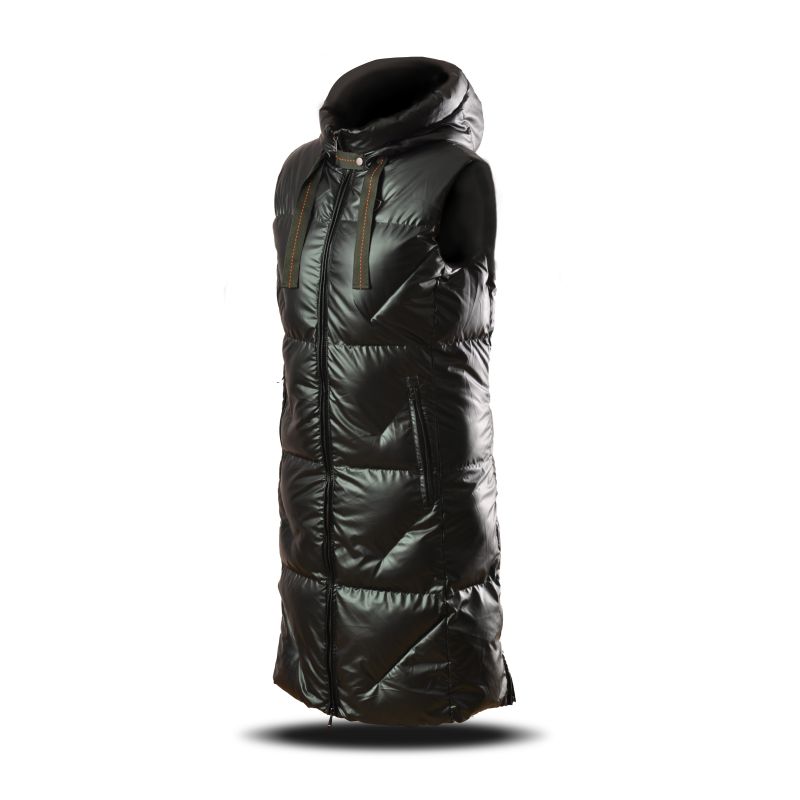Elegantní zimní dlouhá dámská vesta z jemného nylonového materiálu se zajímavými módními prvky. Díky konstrukci a typu výplně, kterou tvoří syntetické peří, je velice hřejivá. Ochrání na dlouhých procházkách přírodou i ve víru velkoměsta.