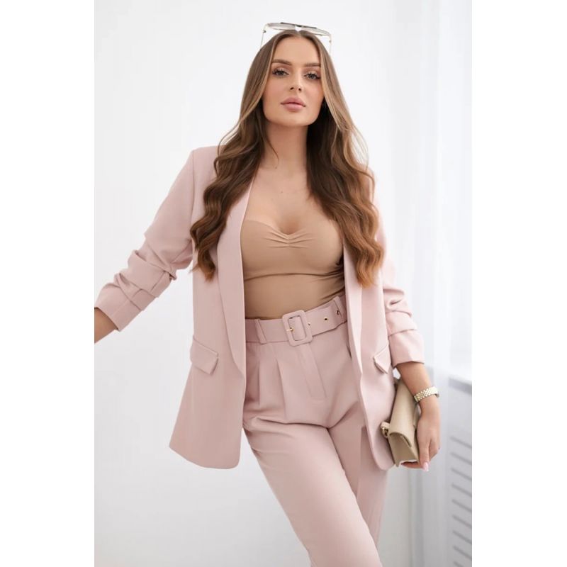 Představujeme Vám elegantní set bundy a kalhot. Bunda bez zapínání s předními klopami. Bunda má podšívku. Kalhoty s kapsami a páskem. V zadní části nohavic je všitá gumička. Velmi módní a stylový set. Sada je vyrobena z vysoce kvalitního materiálu. Velikost je univerzální a bude vhodná pro dámy ve velikosti S, M nebo L.