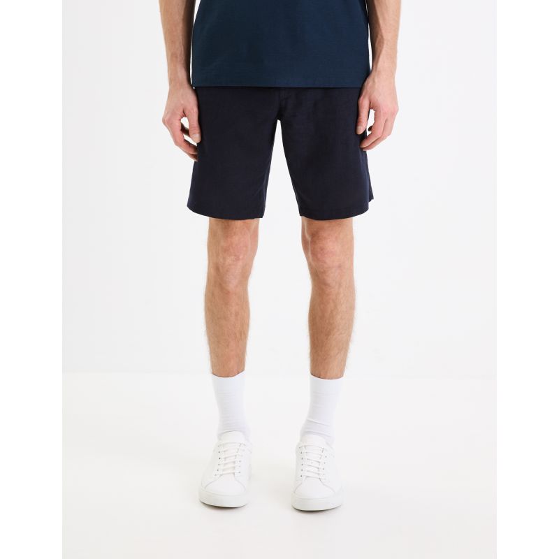 Plátěné kraťasy s pružným pasem. V pase stahovací šňůrka. Přední šikmé kapsy. Zadní zapuštěná kapsa. Příjemný materiál len a bavlna.