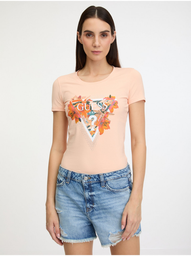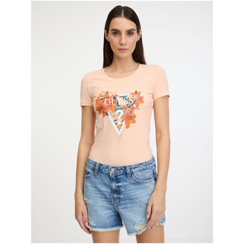 Meruňkové dámské tričko Guess Tropical Triangle - Dámské