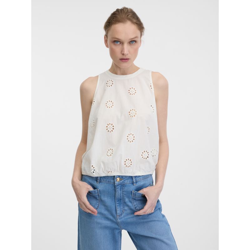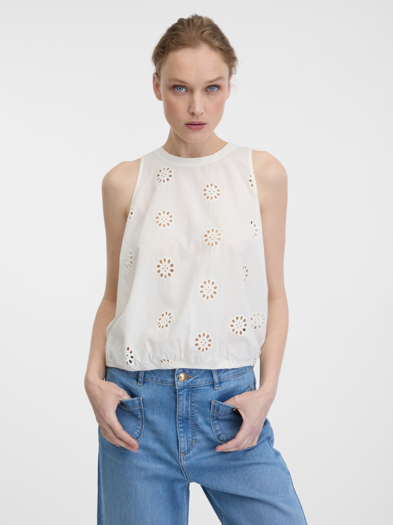 Barva: BíláDélka rukávu: bez rukávuVýstřih: kulatýModelka měří: 175 cmModelka má na sobě velikost: 36/SVzor: děrovanýMateriál: hlavní část: 100% bavlna, zadní část: 96% viskóza, 4% elastanKód produktu: 1000521001000