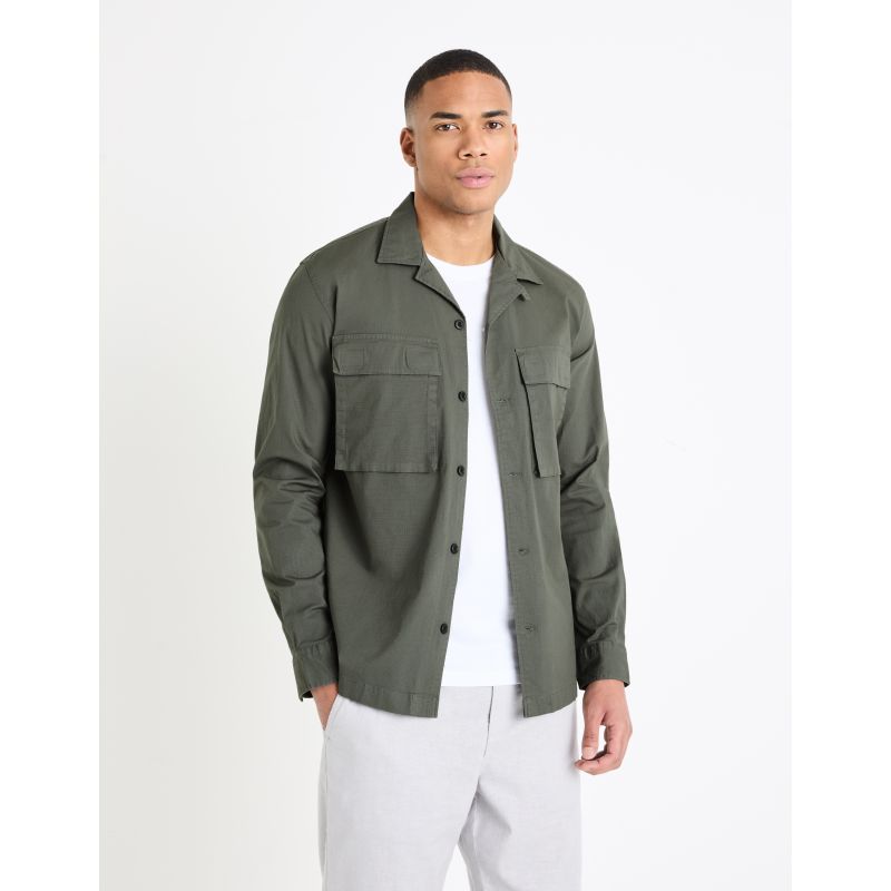 Košile pro moderního muže, který si cení stylu a funkčnosti. Košile má volný střih, límeček s rozhalenkou a zapínání na knoflíčky. Na hrudi našité velké kapsy s klopou. Dlouhé rukávy s manžetou.