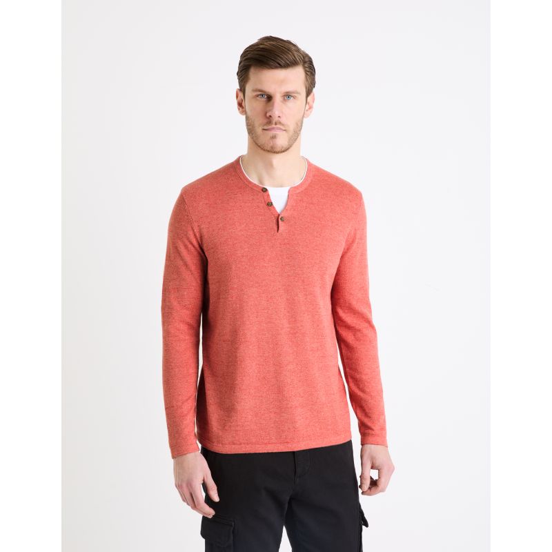 Melírovaný svetr s kulatým výstřihem a zapínáním na knoflíčky. U krku bílá vsadka. Dlouhé rukávy a rovný střih. Svetr je převážně z bavlny a skvěle vynikne k džínům nebo chino kalhotám.