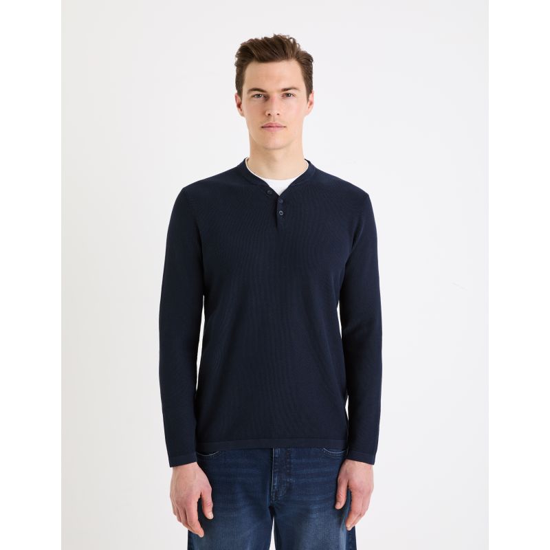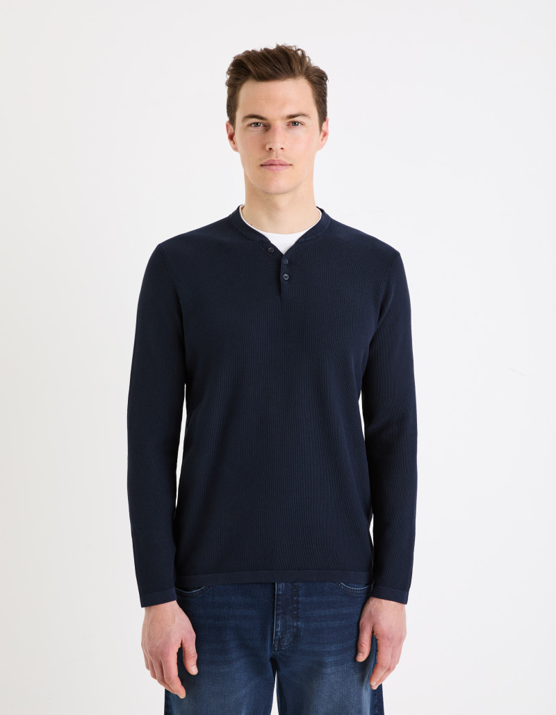 Jednobarevný bavlněný svetr s kulatým výstřihem a zapínáním na knoflíčky. Svetr má dlouhé rukávy a rovný střih.