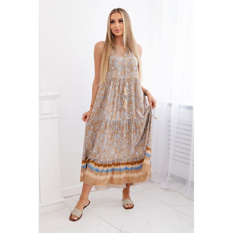 Dámské viskózové šaty s výstřihem na zavazování - camel