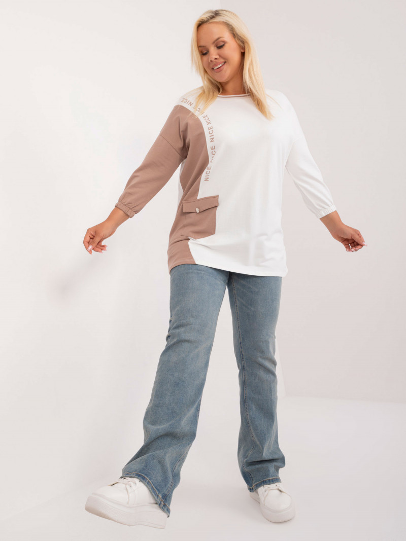 Modelka má na sobě univerzální velikost. Rozměry modelky: výška 172 cm, prsa 103 cm, pas 73 cm, boky 103 cm.   Rozměry halenky jedné velikosti měřeny naplocho: šířka v podpaží - 68 cm, délka rukávu - 44 cm, celková délka - 71 cm.