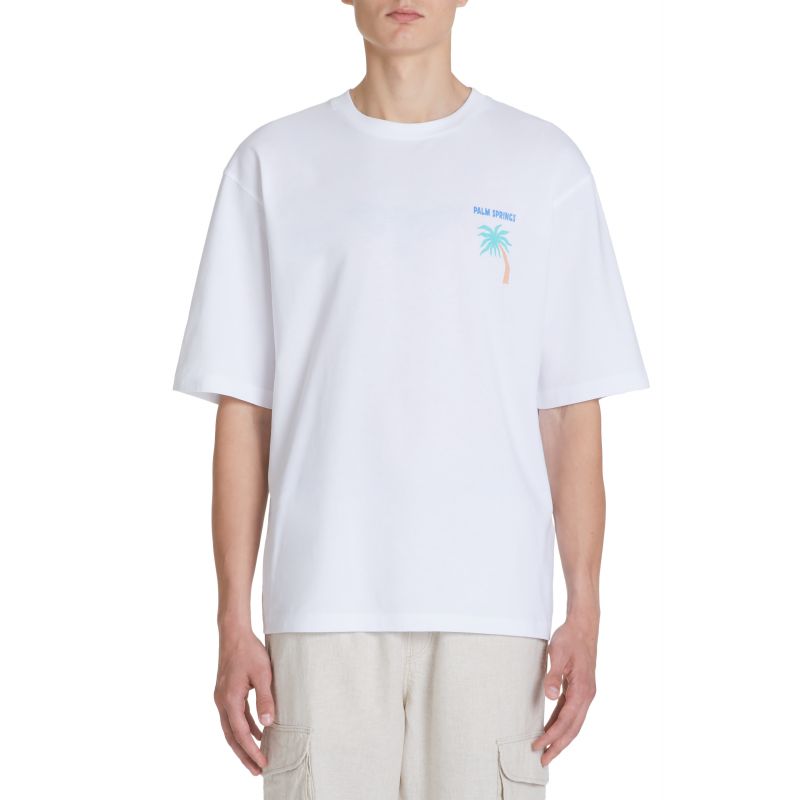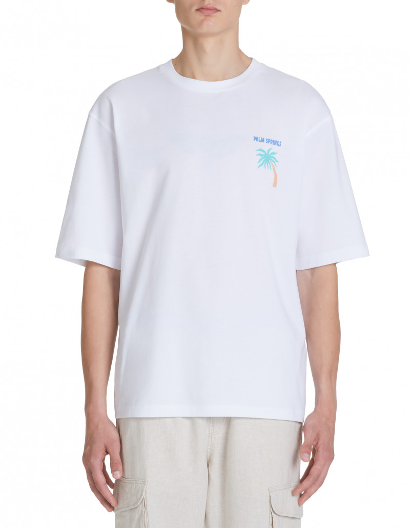 Pohodlné oversized tričko nejen do letních dnů. Bílé oversized tričko s krátkými rukávy, kulatým výstřihem a potisky s plážovými vzory na přední i zadní straně. Vyrobeno ze 100% bavlny.